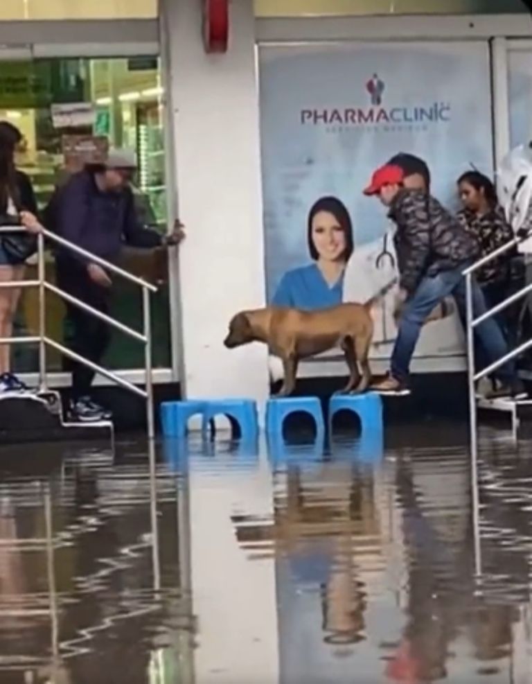 El lomito se encontraba atrapado en medio de las inundaciones, por las intensas lluvias registradas en los últimos días. Las personas, presuntamente ubicadas en un centro comercial, en la demarcación mencionada, se las ingeniaron para poder cruzarlo al otro lado, sin mojarse, colocando bancos azules improvisados como puente. Con ligero temor, el peludo cruzó a través de los asientos de plástico; al llegar, las personas se emocionaron.