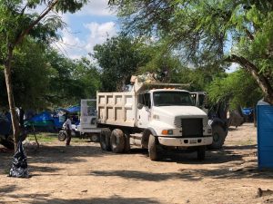 El director de Limpieza Pública, Héctor Hugo Gutiérrez Treviño informó que para la limpia de la zona, este día se utilizó un camión de volteo y un trascabo, logrando levantar varias toneladas de desechos como ropa usada, bolsas plásticas que usaban como carpas, así como también algunas casas de campaña inservibles.