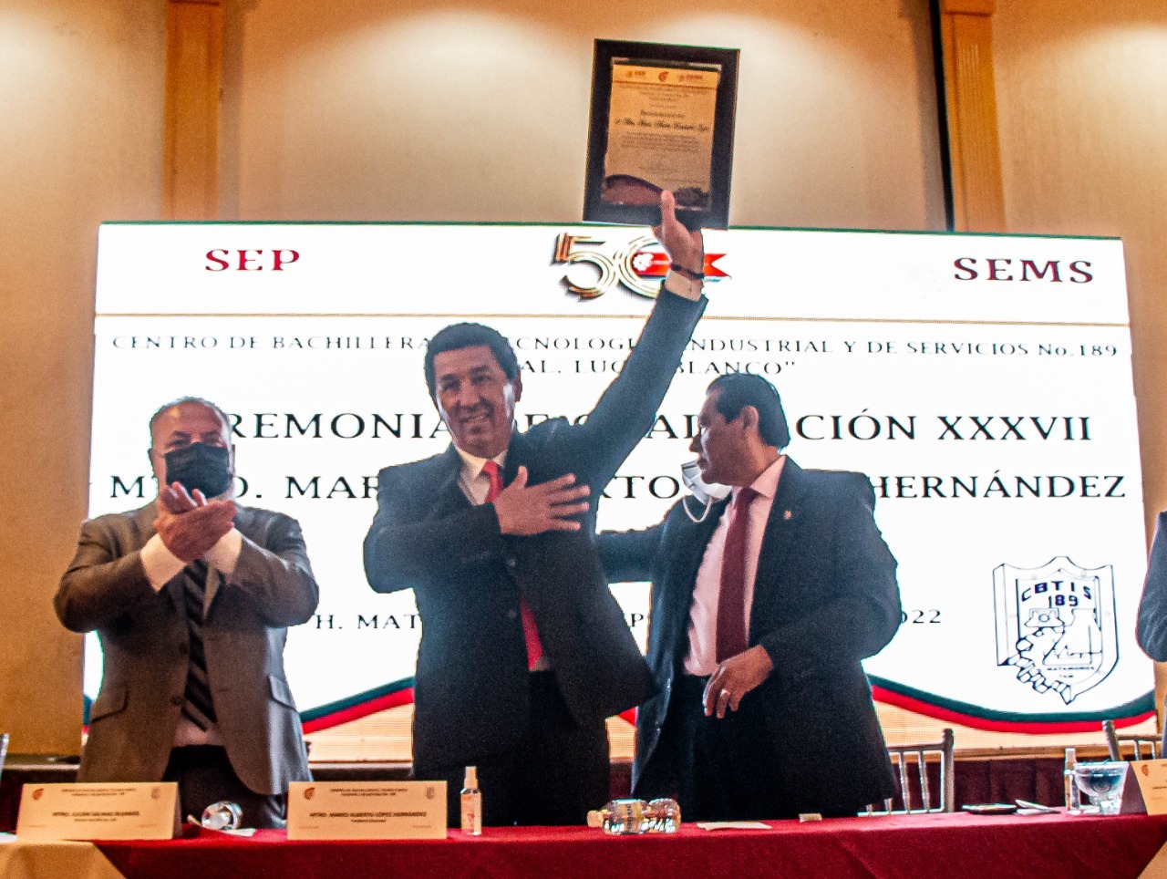 Directivos, alumnos y padres de familia del CBTIS 189 entregaron un reconocimiento al alcalde Mario Alberto López Hernández, por su desempeño y liderazgo al frente del Gobierno de Matamoros y por contribuir al fortalecimiento de la infraestructura en beneficio del plantel educativo.