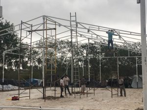 Se pudo observar trabajadores de nueva cuenta, instalar la estructura e ir ensamblando cada parte que la compone; aunque en esta ocasión se ve más reforzada la estructura para evitar que se vuelva a desprender la lona que la recubría.