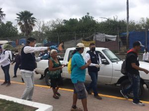 Funcionarios de la Comisión Estatal para la Protección contra riesgos Sanitarios cudieron esta tarde de viernes al campamento de migrantes en el bordo del Río Bravo, para hacer entrega de cubrebocas ante esta situación de con