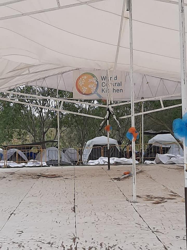 La carpa del World Center Kitchen, la fundación internacional que sirve mil 500 cenas a extranjeros que viven en las margenes del Río Bravo en Matamoros se vino abajo por los fuertes vientos.