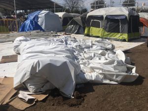 Los migrantes por otra parte, movieron sus casas de campaña que estaban debajo de dos grandes domos, ante el inminente riesgo que también se desprendiera la lona que tiene de techo, moviéndose hacia los laterales fuera de las dos estructuras.