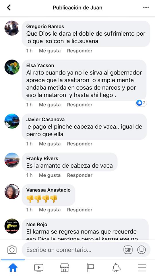 En el grupo Obreros Unidos de Matamoros un perfil identificado como Juan Cupido Matamoros estuvo a cargo de subir el nombre completo y fotografía de la funcionaria desatando una ola de insultos y amenazas.