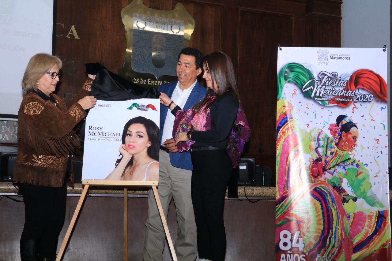 El Presidente Municipal y su esposa Marsella Huerta de López acompañados de Cristina Maltos de Martínez, presidenta del Comité de Fiestas Mexicanas develaron las fotografías de los invitados para la edición 2020 de los festejos que anualmente unen a Matamoros con Brownsville, Texas.