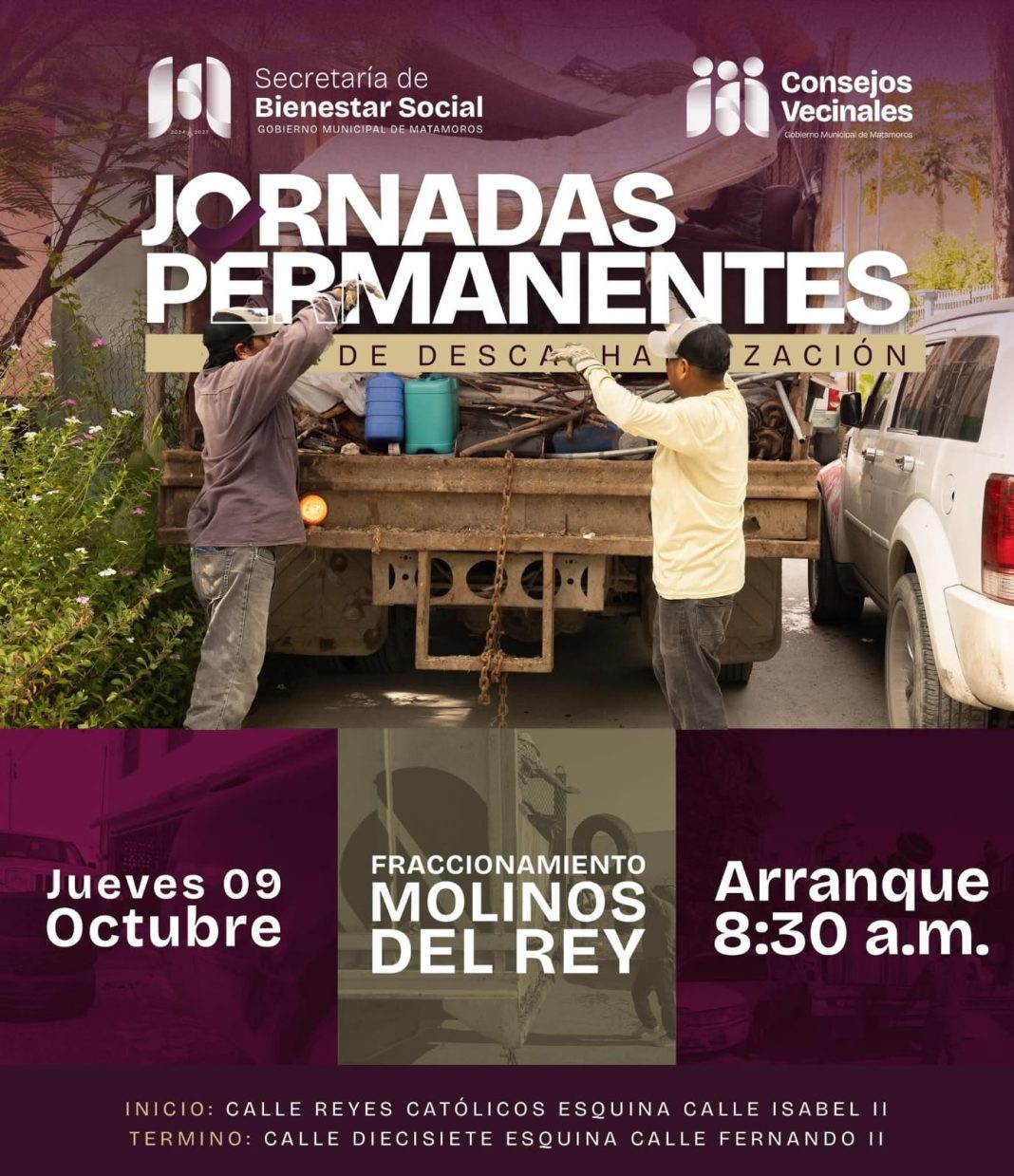 El Gobierno Municipal de Matamoros, que preside el alcalde Beto Granados, invita a la ciudadanía a participar en las jornadas permanentes de descacharrización, que este jueves, a partir de las 8:30 de la malana, llegarán al Fraccionamiento Molinos del Rey.