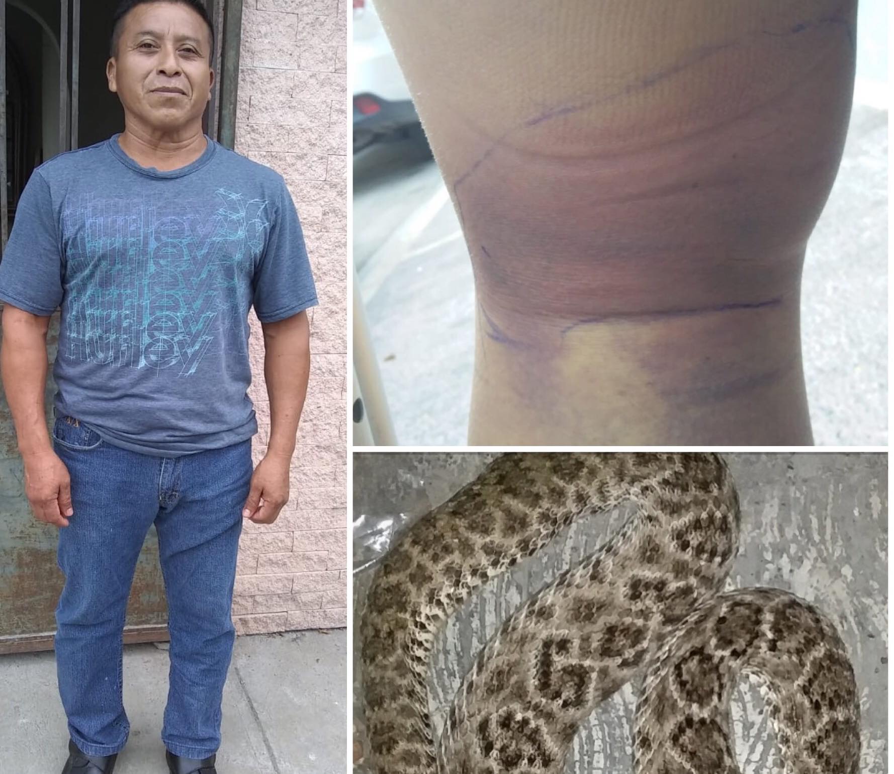 “Eran como las ocho y media de la noche y escuche como si hubiera una fuga de agua, pero al darme la vuelta sentí la mordida de la víbora, cuando salió mi esposa vio que era cascabel, me dio una pala y fue cuando le aplaste la cabeza”.