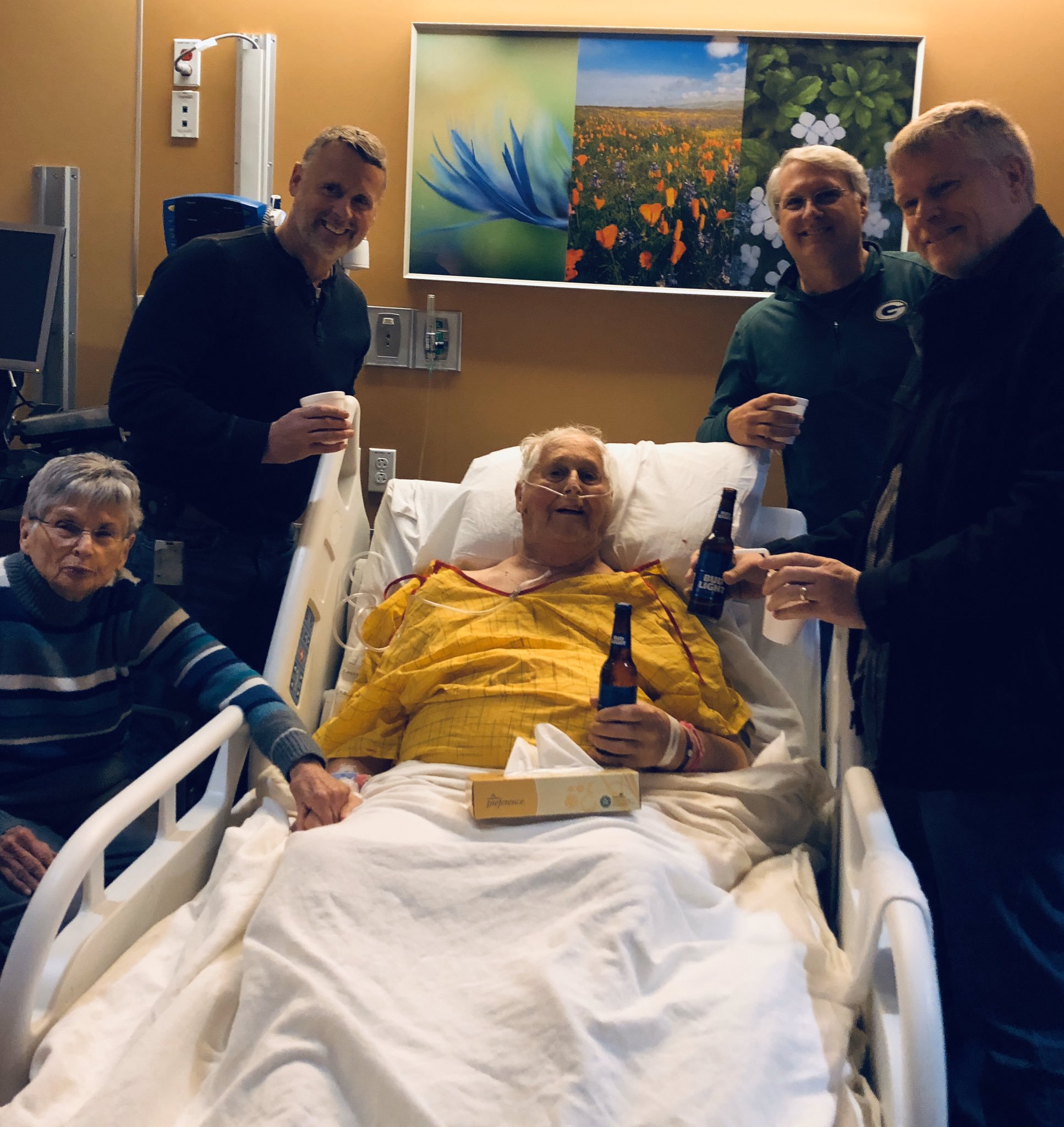 Su voluntad fue escuchada y sus hijos llevaron cervezas al hospital y las compartieron con él. La historia fue difundida en Twitter por su nieto Adam Schemm.