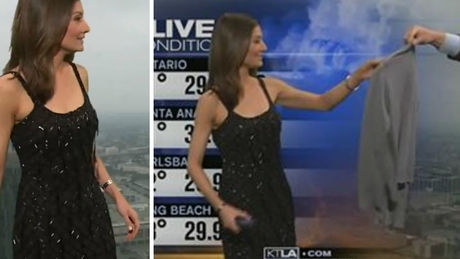 Justo cuando Chan, del canal 5 de Los Ángeles, daba el reporte sobre el estado del tiempo, apareció un brazo a un costado del televisor con suéter en mano, instando que ésta se tapara, pues la estación había recibido “muchos correos”.