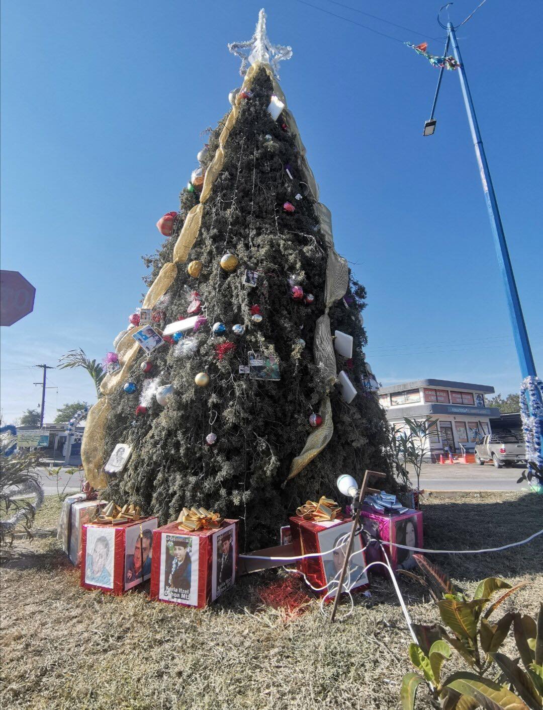 Aunque de lejos parece un pino tradicional de navidad, al acercarse, el árbol con sus esferas y cajas de regalo tapizadas de rostros dibuja el drama de más de 3 mil desaparecidos en San Fernando, Tamaulipas.