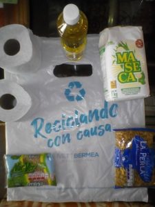 sosteniendo las bolsa con los precarios apoyos.
