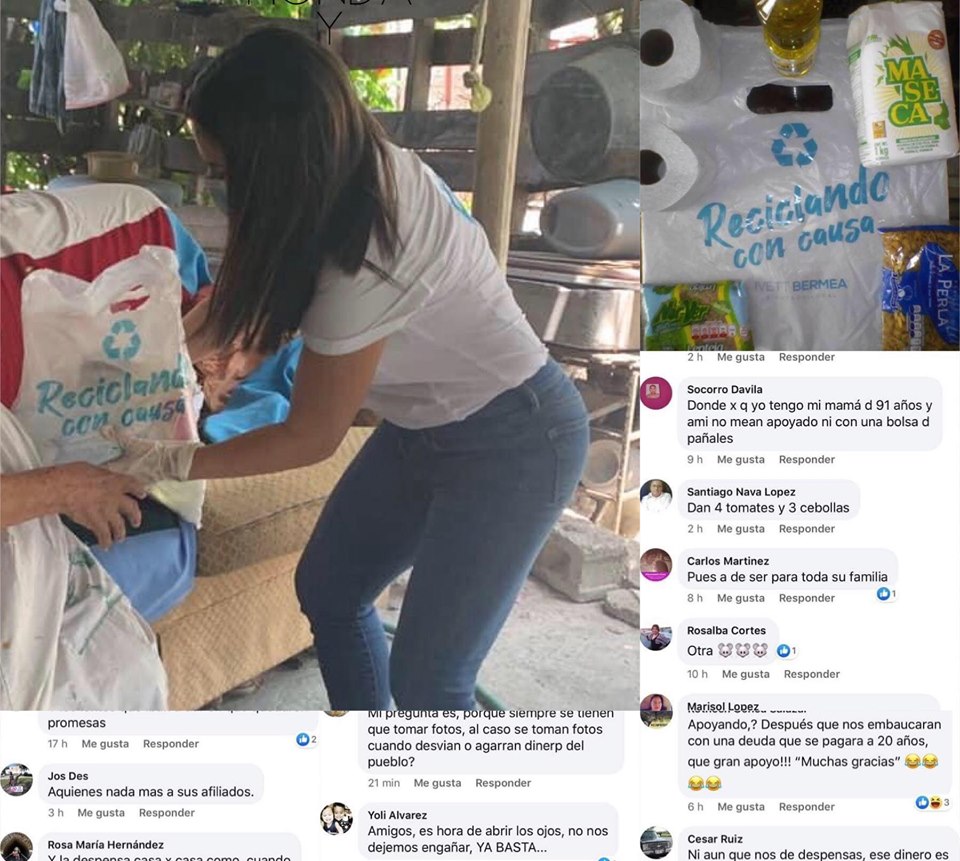 Dos rollos de papel sanitario, una bolsa de lentejas, una maseca y el bote mas pequeño de aceite conforman las despensas que la diputada Ivett Bermea Vázquez esta repartiendo a personas vulnerables, a quienes obliga a tomarse foto para sus redes sociales y así acallar la oleada de criticas que recibió durante todo el fin de semana.