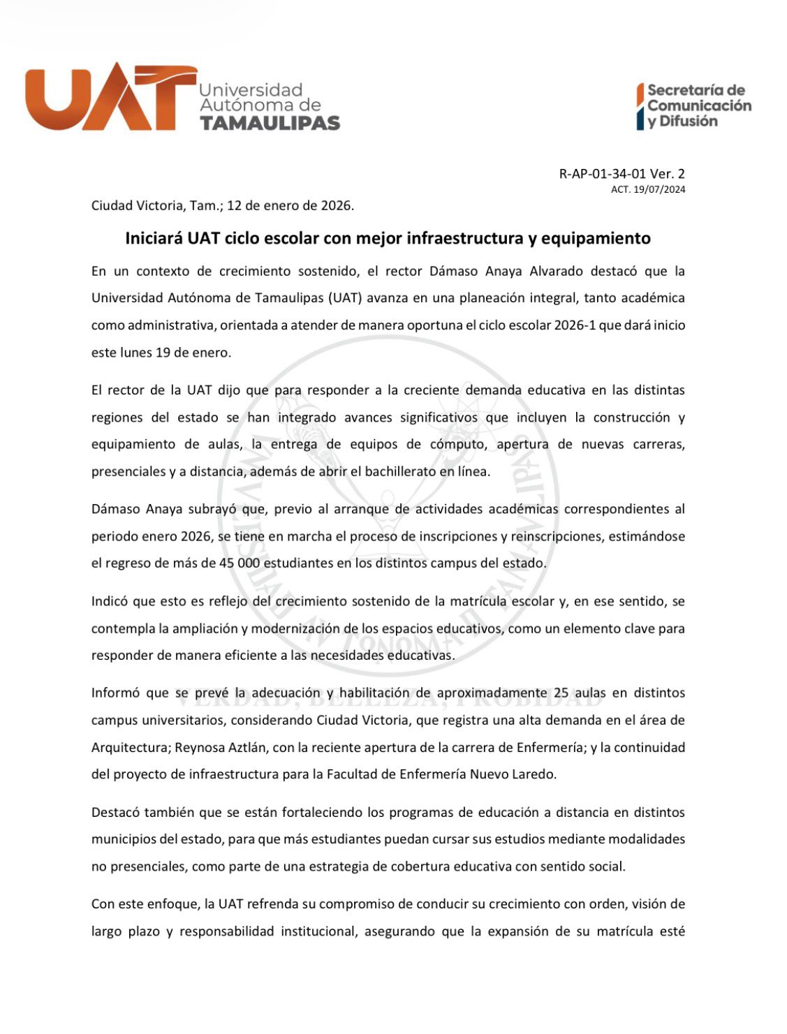 En un contexto de crecimiento sostenido, el rector Dámaso Anaya Alvarado destacó que la Universidad Autónoma de Tamaulipas (UAT) avanza en una planeación integral, tanto académica como administrativa, orientada a atender de manera oportuna el ciclo escolar 2026-1 que dará inicio este lunes 19 de enero.