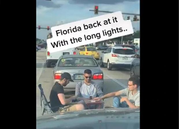 Filmado y publicado Dylan Kjos, la escena muestra a tres de sus amigos sentados en sillas plegables alrededor de una mesa en una carretera de Cape Coral, en Florida. Los jóvenes están en pleno juego de cartas Uno, mientras esperan el semáforo en rojo, que dicen dura demasiado.
