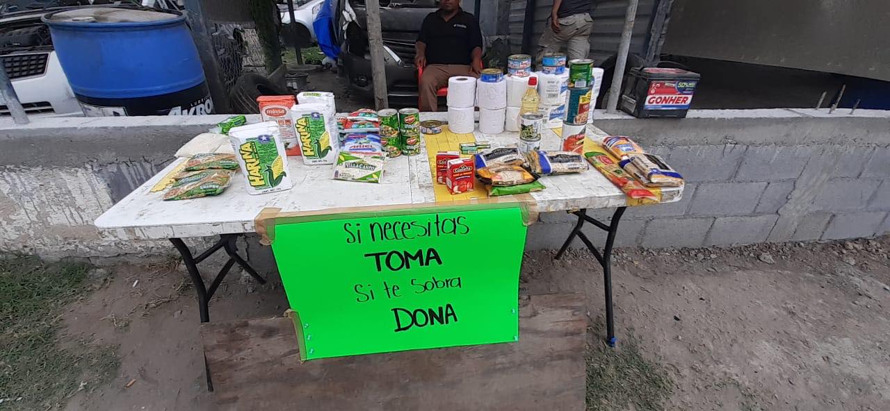 Inicialmente junto con sus compañeros de trabajo juntaron sus recursos y compraron artículos de despensa y los pusieron en una mesa a bordo de calle, con una cartulina con la leyenda “si necesitas toma y si te sobra dona”.