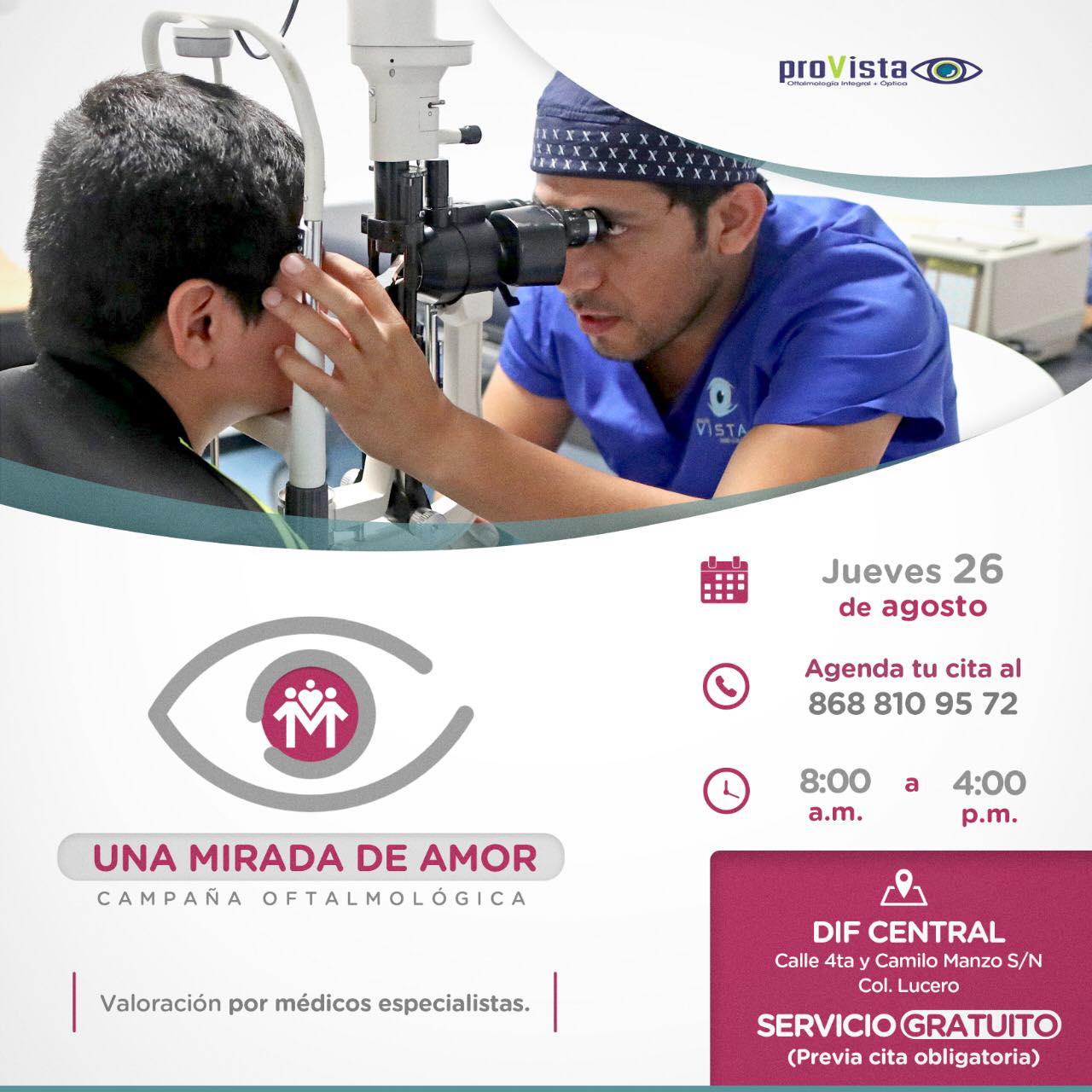 El Sistema DIF Matamoros que preside la C.P. Marsella Huerta de López, en coordinación con médicos especialistas en oftalmología, darán continuidad a la campaña oftalmológica “Una Mirada de Amor” el próximo 26 de agosto, con la finalidad de detectar patologías visuales para prevenir y ofrecer tratamientos o alternativas que mejoren la visión a bajo costo.