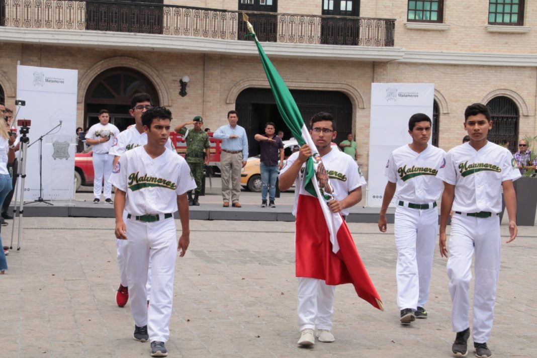 En presencia de padres de familia, autoridades  militares, integrantes del cabildo y funcionarios municipales, el Presidente Municipal entregó la bandera mexicana que acompañará a los jóvenes beisbolistas durante su participación en el citado campeonato.