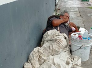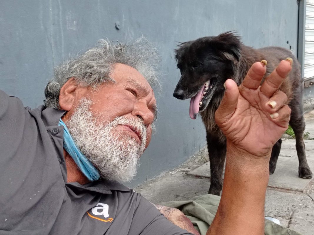 Una persona que es su «amigo de batallas» lo auxilia día con día, pidiendo dinero en la entrada del 7 ELEVEN que se encuentra frente al IMSS, con ese dinero compra electrolitos, comida y agua.