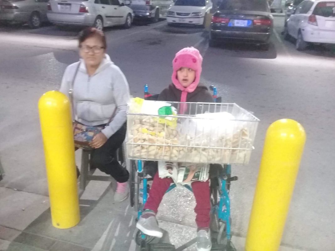 Al ser entrevistada por lafronteradice.com la señora revela que cada noche, sin importar las bajas temperaturas o la lluvia incluso, salen de su casa en la colonia Valle Real para buscar ganar unas monedas que ahorra para la silla de ruedas que necesita su hija.