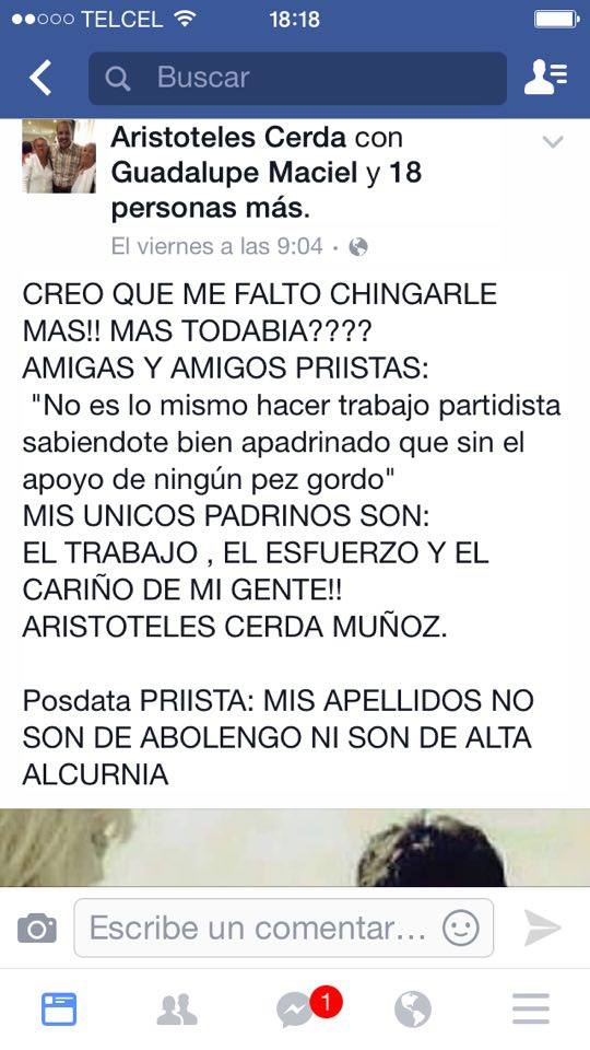 Pero ahora, desconociendo tales mensajes, ya de regreso al redil, Aristoteles Cerda Muñoz se pone de rodillas nuevamente ante el PRI y revela a sus seguidores que respaldara el proyecto de Chuchin y de Baltazar Hinojosa Ochoa.