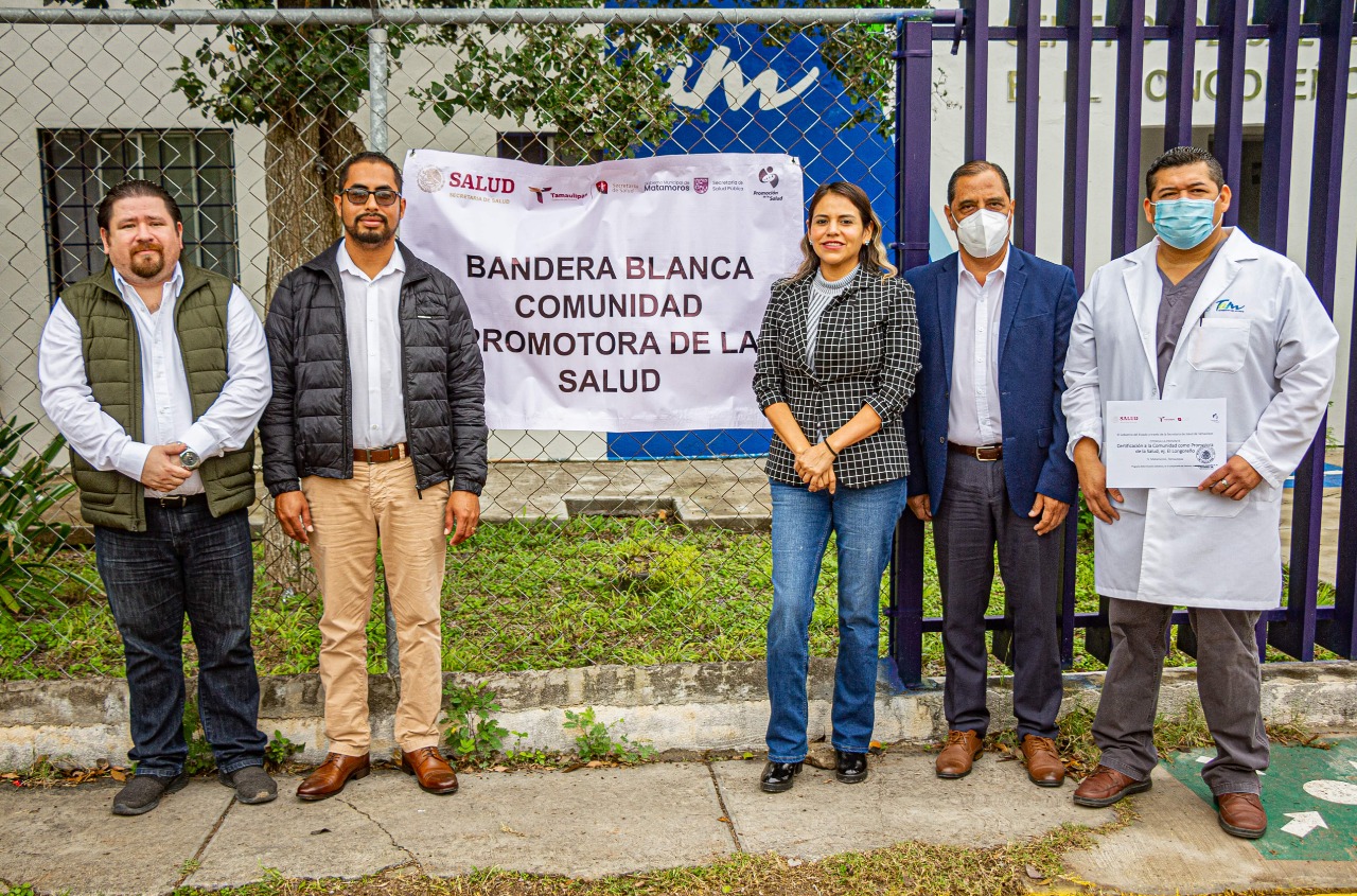 Correspondió a la Dra. Gilma Dinora Alcocer, entregar el reconocimiento que otorga el Gobierno del Estado a través Secretaría de Salud en Tamaulipas, al Dr. Ubaldo Hernández, médico titular en el Centro de Salud del Ejido el Longoreño como comunidad promotora de la salud; enseguida fue colocada la bandera blanca en el exterior del centro médico.