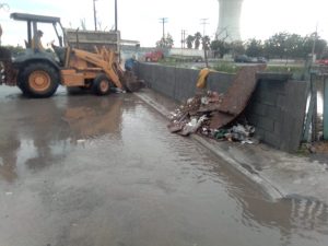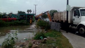 Esta mañana se envió maquinaria y camiones de volteo al Dren 20 de Noviembre, ya que la basura que los mismos ciudadanos tiran en las calles y en los canales, se convierten en tapones que impiden la circulación del agua.