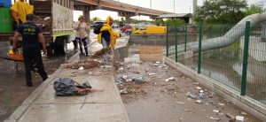 Personal de Limpieza Pública recoge los desechos que son arrastrados por la corriente del agua y que tapan las bocas de tormenta, en tanto que la Secretaría de Desarrollo Urbano y Ecología continúa trabajando en la limpieza de drenes.