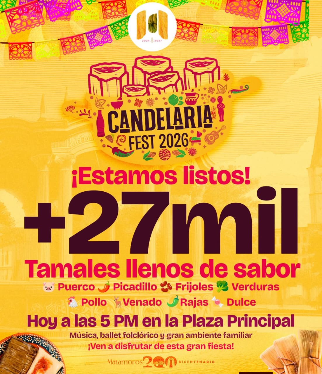 Por iniciativa del alcalde Beto Granados, el Gobierno Municipal de Matamoros invita a la ciudadanía a disfrutar del Candelaria Fest 2026, una celebración que llena de música, sabor y tradición la Plaza Principal, en el marco de las festividades del Bicentenario de Matamoros.