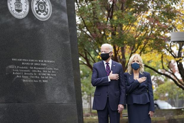 Biden interrumpió su planificación a puertas cerradas solo para rendir homenaje a los soldados caídos en guerras al asistir a una ceremonia en el monumento a la Guerra de Corea en Filadelfia.