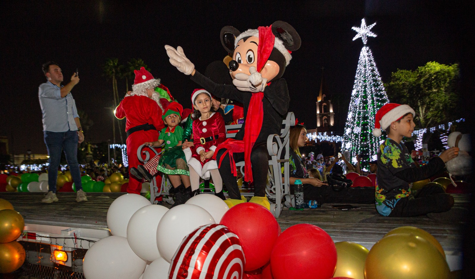 Miles de familias acompañaron al alcalde Mario Alberto López Hernández y a su esposa Marsella Huerta, durante el encendido del monumental pino instalado en la plaza principal, y en el espectacular desfile, que invadió con la magia de la Navidad las calles de Matamoros.