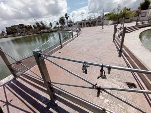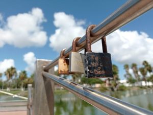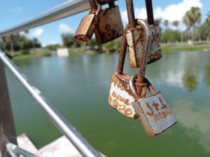 En en el parque El Laguito, de la Avenida Canales, llegan diversas parejas para colocar candados de amor en los cuales colocan las iniciales de la pareja que busca un amor inquebrantable.