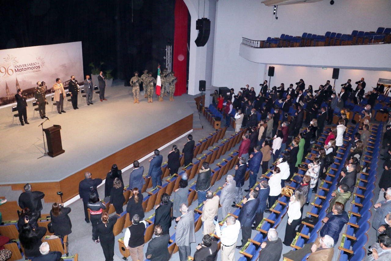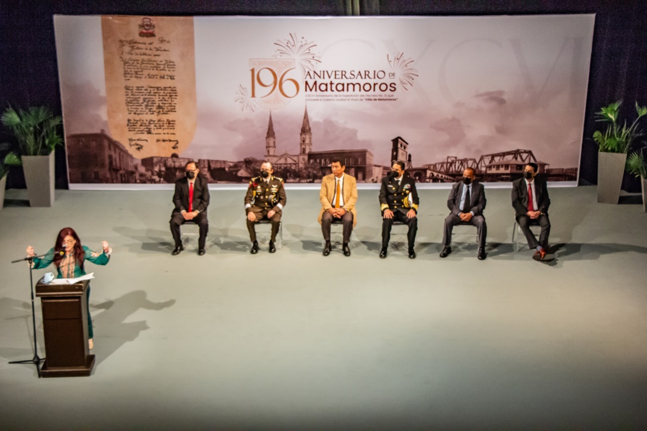 Autoridades municipales, educativas y militares conmemoraron este viernes el 196 aniversario de Matamoros, en el marco de una ceremonia cívica realizada en el Teatro de la Reforma, la cual cumplió con todas las medidas de seguridad sanitaria.