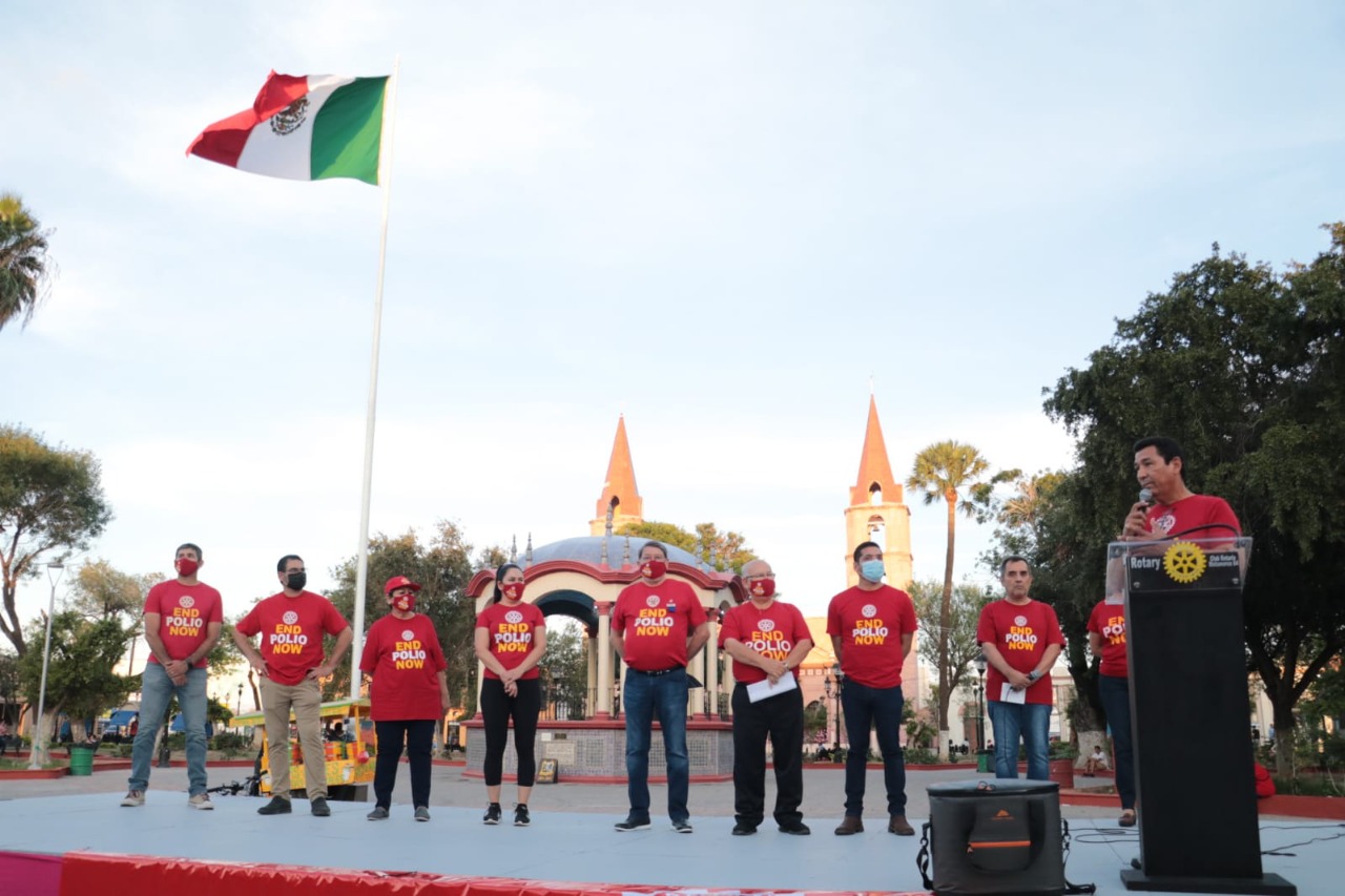Con una rodada ciclista y la iluminación de la fachada de la Presidencia Municipal con el color emblemático de la Lucha contra la Polio, el alcalde Mario Alberto López Hernández y su esposa Marsella Huerta de López encabezaron la ceremonia de celebración de un aniversario más, de este importante esfuerzo que a nivel internacional encabezan los rotarios.
