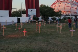 Frente a la escultura “La Gran Puerta de México” fueron instaladas 68 cruces en memoria de las víctimas por el delito de feminicidio en México, marco en el que se mencionó que de cada 10 mujeres, seis son víctimas de algún tipo de violencia.