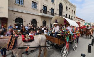 López Hernández y su esposa Marsella, acompañados también por su hija Melissa encabezaron el vistoso contingente a bordo de una carreta jalada por un caballo; decorada con motivos mexicanos, entre ellos, el colorido de sus flores, listones y dos faroles.