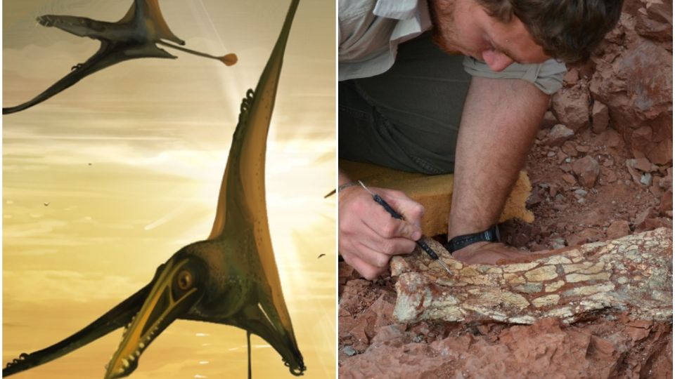 El nuevo espécimen de antiguo reptil volador, o pterosaurio, medía alrededor de 9 metros de largo y los investigadores dicen que es un antecesor de las aves tal y cómo las conocemos ahora; fue una de las primeras criaturas de la Tierra en usar alas para cazar a sus presas desde el aire.