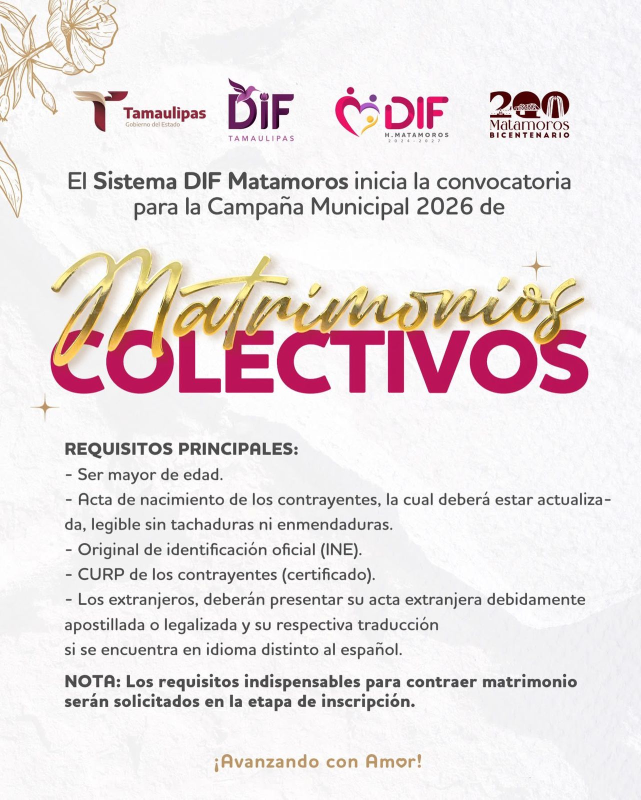 Con el firme objetivo de brindar certeza jurídica a las familias matamorenses, el Sistema DIF Matamoros mantiene abierta la convocatoria para la Campaña de Matrimonios Colectivos, una iniciativa realizada en estrecha coordinación con el Sistema DIF Tamaulipas y el Gobierno del Estado.