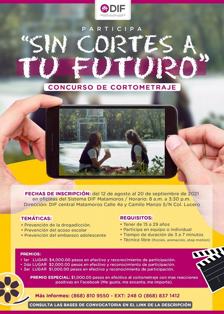 En el marco del Día Internacional de la Juventud, el Sistema DIF Matamoros encabezado por la C.P. Marsella Huerta de López invita a la población juvenil de 15 a 29 años a participar en el concurso de cortometrajes “Sin Cortes a tu Futuro”.