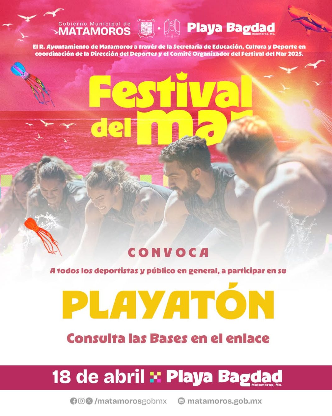 El Gobierno Municipal de Matamoros, encabezado por el Presidente Municipal Alberto Granados Fávila, invita a la ciudadanía a participar en el Playatón Deportivo 2025, un evento que combinará el deporte, como parte de las actividades del Festival del Mar 2025.