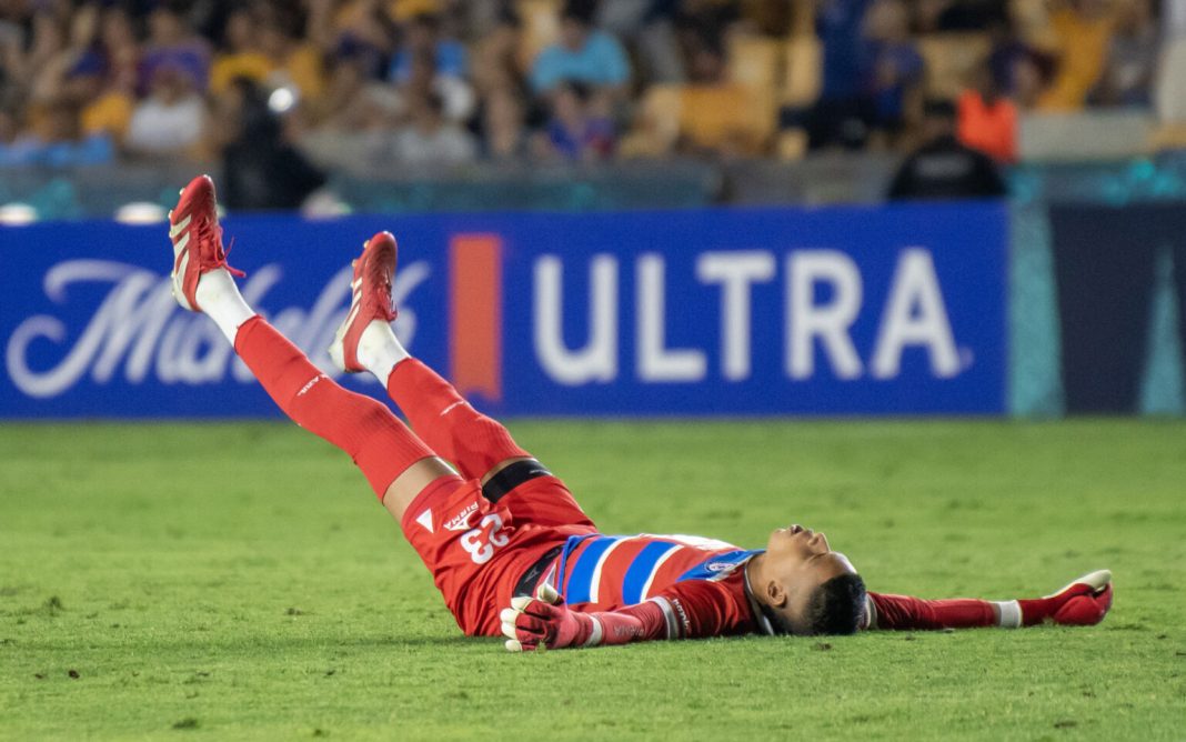 En la última jugada de la mitad inicial, Tigres llegó al área con ventaja y otra vez dejó ir el gol, con un remate errático de Uriel Antuna.