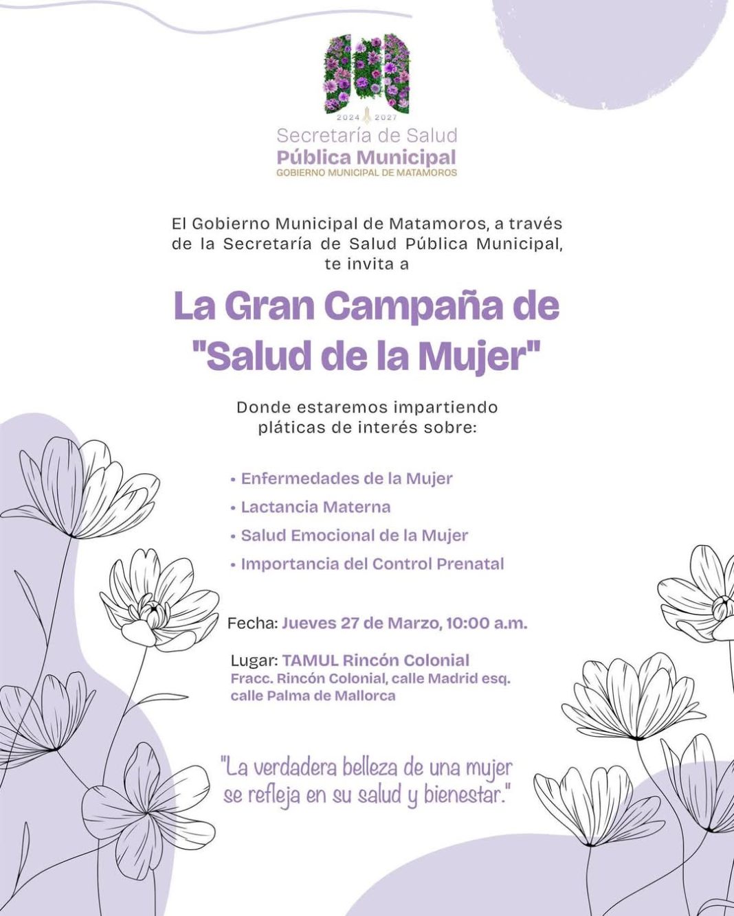 En esta Gran Campaña «Salud de la Mujer», se impartirán pláticas enfocadas en temas como enfermedades específicas de la mujer, lactancia materna, salud emocional femenina y la importancia del control prenatal.