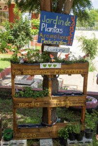 El jardín consta de diversas especies, entre las que se destacan poleo, menta, yerbabuena, mejorana, albahaca y tomillo, las cuales reciben agua mediante un sistema de riego automático a base de botellas plásticas que permiten el pasolento del agua para regular el goteo y están ubicadas en llantas y tarimas de madera reutilizadas como maceteros.