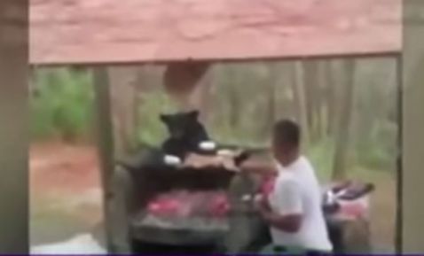 Hasta su parrilla legó un oso quien se vio atraído por los olores del cabrito que se cocinaba, sin embargo el cocinero no dejó que le quitara sus viandas.