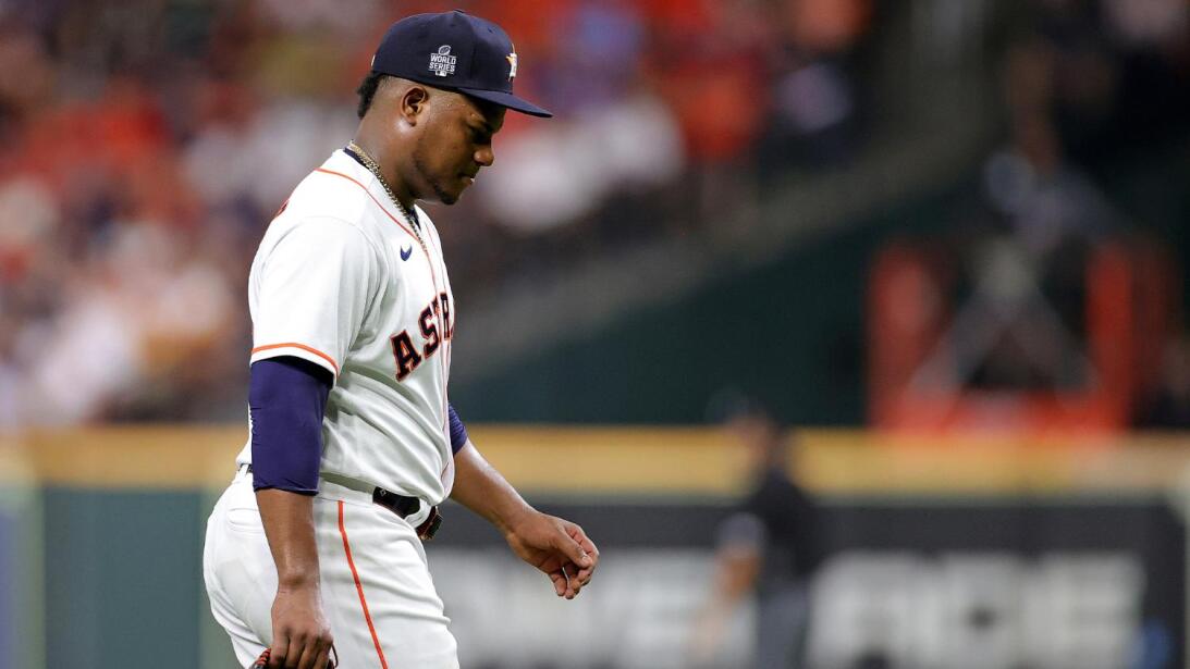No fue la noche para Framber Valdez, quien permitió cinco carreras en dos episodios para poner por delante a los Bravos. Crédito: Carmen Mandato/Getty Images.