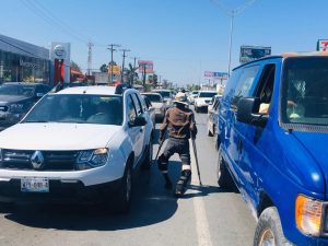 Vendiendo chicles, dulces, paletas buscar ganarse una moneda para su sustento diario, ayudado por una silla de ruedas para desplazarse hasta uno de los cruceros más transitados de periférico y sexta sur, ofrece a los automovilistas que pasan por este lugar.