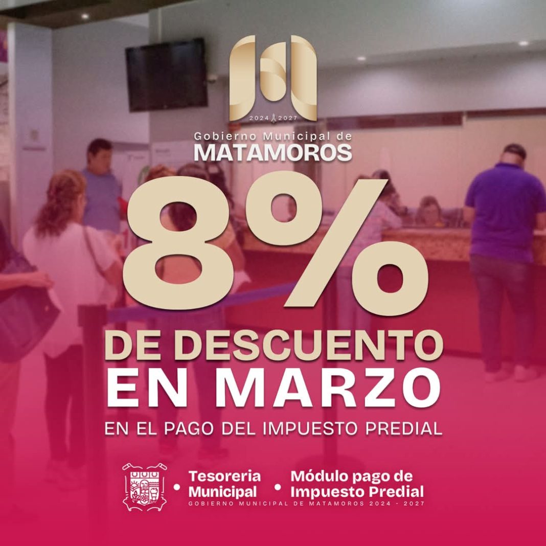 Durante marzo, el Gobierno de Matamoros ofrece un descuento del 8% en el pago del impuesto predial para los ciudadanos que se encuentren al corriente en sus contribuciones.