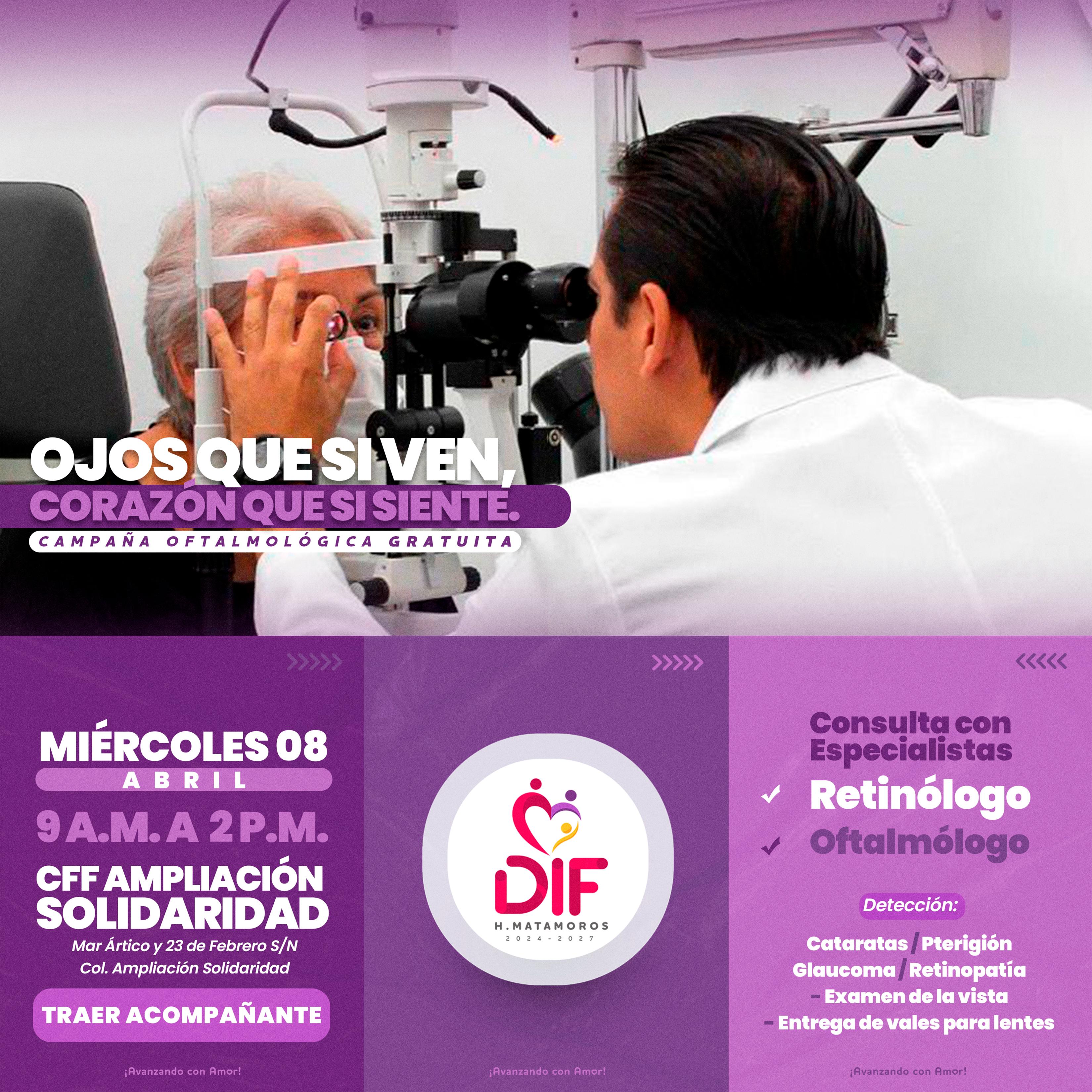 Con el firme objetivo de mejorar la salud visual de las familias matamorenses, la Lic. Ana Ariceaga de Granados, Presidenta del Sistema DIF Matamoros, lanzó una invitación abierta a la ciudadanía para participar en la campaña permanente “Ojos que sí ven, Corazón que sí siente”. Esta jornada de salud ofrecerá valoraciones oftalmológicas de manera totalmente gratuita para detectar y atender diversos padecimientos visuales.