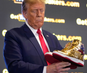 El republicano presentó el modelo «Never Surrender» (Nunca te rindas), un par de zapatos dorados adornados con detalles de la bandera estadounidense.
