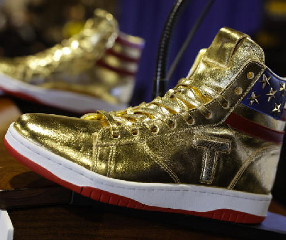 El republicano presentó el modelo «Never Surrender» (Nunca te rindas), un par de zapatos dorados adornados con detalles de la bandera estadounidense.