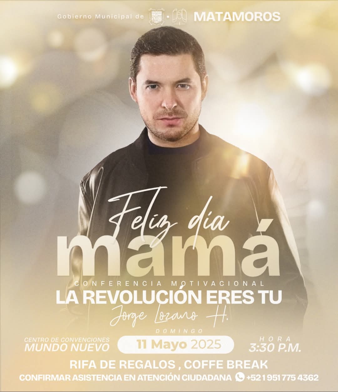 Con motivo del Día de las Madres, el Gobierno Municipal de Matamoros invita cordialmente a todas las mamás a una tarde especial de inspiración y reconocimiento con la conferencia motivacional “La Revolución Eres Tú”, impartida por el reconocido conferencista Jorge Lozano H.
